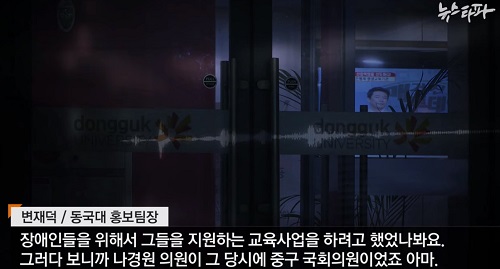 이 뿐만이 아니었다. <뉴스타파>가 제기한 ‘플랜 B’는 성신여대가 아닌 자신의 지역구에 자리한 동국대학교 부설 평생교육원이었다. 동국대 변재덕 홍보팀장은 “당시 총장과 나경원 의원이 만나 장애성인 평생교육 프로그램 지원 사업을 논의했다”고 말했다. <뉴스타파>가 취재한 논의와 실행 과정은 이랬다.