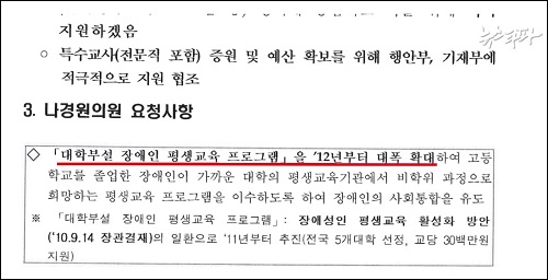 “나경원 의원은 2011년 5월 교과부 공무원들을 만난 자리에서 대학부설 장애인 평생교육 프로그램을 2012년부터 대폭 확대해 줄 것을 요구했다. 당시 교과부는 2011년 하반기부터 이 사업을 시범 실시할 예정이었다. 이를 위해 국립특수교육원은 대학의 평생 교육원 지정 기관을 공모했고, 같은 해 6월 5개 대학을 선정했다. 동국대 평생교육원도 응모했지만 아쉽게 탈락했다.