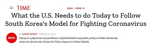 듀크 대학 글로벌 건강 및 공공 정책의 의사이자 교수이며, 글로벌 건강정책 영향센터의 디렉터로 재직 중인 야미 교수(GAVIN YAMEY)의 17일자 타임지 칼럼 What the U.S. Needs to do Today to Follow South Korea’s Model for Fighting Coronavirus (한국식 코로나바이러스 대처 모델을 따르기 위해 미국이 지금 해야 할 일)을 통해 미국은 코로나바이러스 위기에서 이탈리아처럼 할 것인지, 한국처럼 해야 할 것인지를 질문하면서 이탈리아의 사례와 한국 등의 사례를 들면서 미국이 가야할 길을 제시하고 있다.