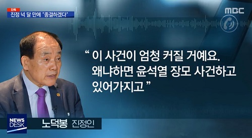 19일 MBC 보도에 따르면, 지난달 4일 의정부지검 인권감독관실 수사관이 윤 총장 장모 최모 씨의 은행잔고증명서 위조 사건을 수사해달라며 진정서를 낸 노덕봉 씨에게 전화를 걸어왔다.
