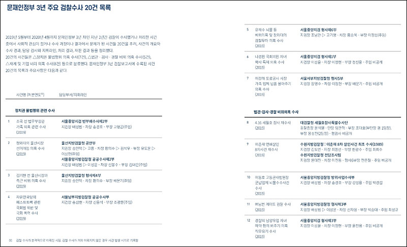 300쪽 분량의 보고서로 지난해 5월부터 올해 4월까지 진행된 검찰 수사에 대한 종합평가를 담았다. △조국 가족 의혹 관련 수사 △ 패스트트랙 관련 국회법 위반 및 국회 폭력 수사 △ 나경원 자녀 학사 특혜 의혹 수사 △ 4.16 세월호 참사 재수사 △ 라임자산운용 환매중단 사태 수사 등 20건이 포함됐다.