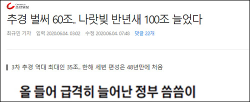 조선일보는 <추경 벌써 60조..나랏빚 반년새 100조 늘었다>란 기사에서 “국가 채무는 840조2000억원으로 지난해 대비 99조4000억원 늘고, 국가채무비율은 지난해 37.1%에서 43.5%로 껑충 뛴다”고 보도했다.