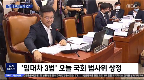 같은 날 MBC <뉴스데스크>의 <“한 달 새 1억”…전셋값 ‘고공행진’ 언제까지> 리포트의 말미다. 전세값 혼란을 막기 위한 정부여당의 고육지책 중 하나인 임대차 3법이 논의조차 이뤄지지 못했고, 기재위는 열리지조차 못했다는 질타였다.