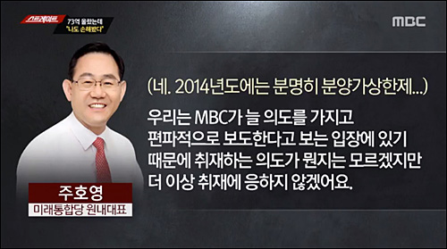 주 원내대표는 “우리는 MBC가 늘 의도를 갖고 편파적으로 보도한다고 보는 입장에 있기 때문에, 취재하는 의도가 뭔지는 모르겠지만, 더 이상 취재에 응하지 않겠다”고 했다.