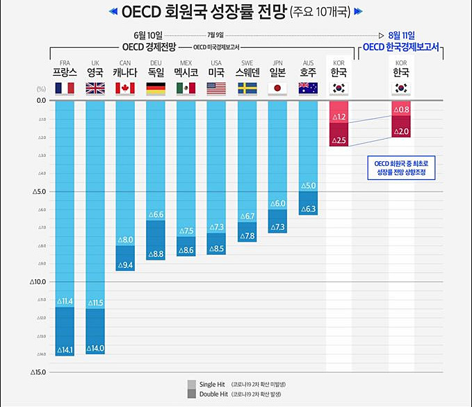 OECD가 회원국 중 상향 조정한 사례는 처음으로 월등한 1위다. 2~5위인 터키(-4.8%), 호주(-5.0%), 칠레(-5.6%), 덴마크(-5.8%)와도 차이가 크다.