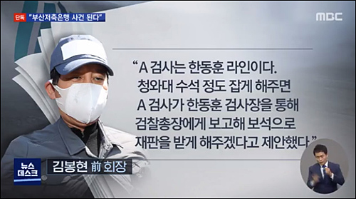 1일 MBC <뉴스데스크>의 <“‘부산저축은행 사건 될 것’ 회유 받았다” 진술> 단독 보도 중 일부다. 김 전 회장 주장대로라면, 꽤나 파급력이 강할 사안이라 볼 만 했다. MBC는 검찰이 최근 이러한 내용이 포함된 김 전 회장의 자술서를 받은 것으로 확인됐다면서 “실제로 술자리 참석자로 지목된 검사 중 2명은 예전 부산저축은행 수사팀에서 일했다”고 덧붙였다.
