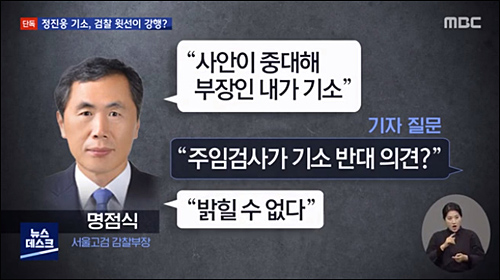 이런 이유로 서울고검 감찰부의 주임 검사도 독직폭행으로 기소하는 데 회의적 의견을 보인 걸로 전해졌습니다. 그러자 명점식 서울고검 감찰부장은 이 사건을 자신에게 재배당한 뒤, 엿새 뒤 정 차장검사를 전격 기소했습니다.”