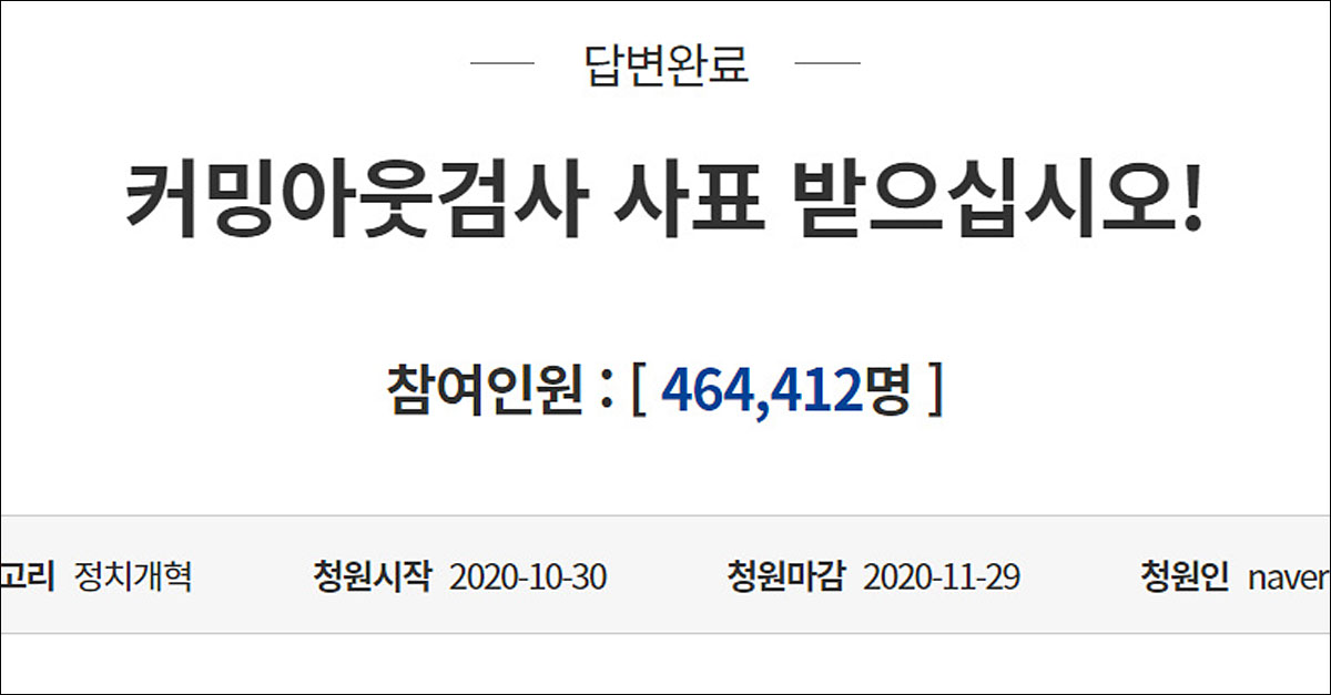 이에 추 장관이 ‘친 윤석열 검사’들의 ‘커밍아웃’을 환영(?)하는 페이스북 글을 게시했고, 이에 일부 검사들이 반발하고 보수언론이 이를 대서특필하면서 ‘추-윤 갈등’을 극대화하기도 했다. 그러자 보다 못한 청원인이 청와대에 “커밍아웃하는 검사들의 사표를 받아달라”고 요청하기에 이른 것이다.