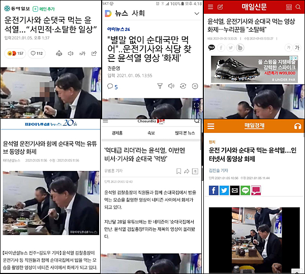 더 나아가 적어도 3년 전 서울중앙지검장 시절 윤 총장이 순대국을 먹는 21초, 아니 정확히는 3초 짜리 영상을 ‘선의’로 기사화하는 언론들은 어디를 바라보고 있는가. 그들에겐 이런 기사가 현재 여론조사상 1, 2위를 다투는 유력 보수 대권주자의 일거수일투족을 쫓는 일상적인 보도 행위이지 않겠는가.