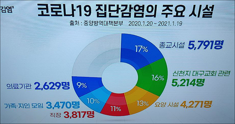 그렇다면 수개월이 지나고 해가 바뀐 지금, 종교시설 관련 확진자 수는 변화가 있었을까. 지난 21일 중앙방역대책본부(방대본)은 정리브리핑에서 우리나라에서 처음 코로나19 환자가 발생한 지난해 1월 20일부터 올해 1월 19일까지 1년간 코로나19 집단 발생 사례 현황을 발표했다. 결과는 어땠을까.