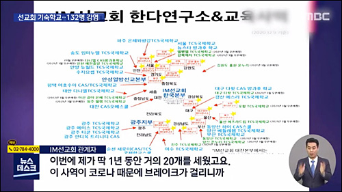 “IM 선교회라는 한 기독교 단체가 운영하는 기숙사 형태의 학교인데 전체 교사와 학생 중 무려 80% 넘는 130여 명이 확진 됐습니다. 그런데 이 선교회에서 운영하는 비인가 학교가 스무 곳이 넘다 보니 전국적인 확산도 우려되고 있습니다.” (25일 MBC <뉴스데스크>, <한 건물 84%가 감염…전국 24곳 시설로 퍼지나> 앵커 멘트 중)