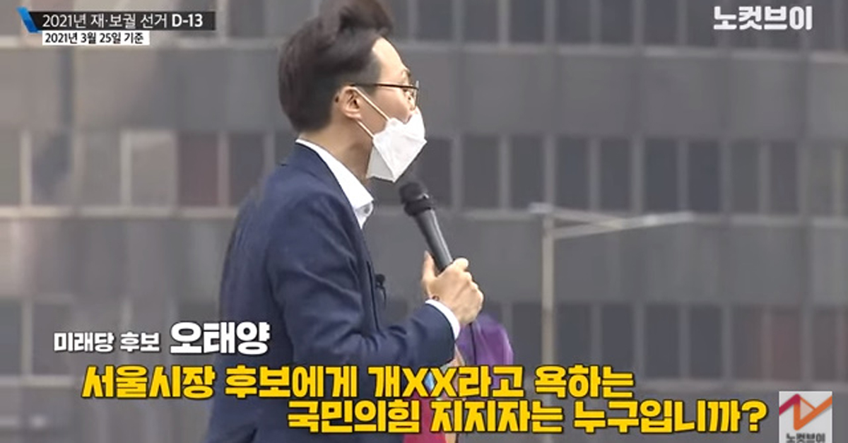 이후 국민의힘 일부 지지자들이 오태양 후보에게 “시끄럽다. 개XX”, “야 이 XX야 조용히 해” 등 욕설과 혐오차별 발언을 했다. 오태양 후보는 “서울시장 공식 후보인 제가 개XX입니까. 서울시장 후보에게 개XX 라고 욕하는 국민의힘 지지자는 누구입니까”라고 항변했다.