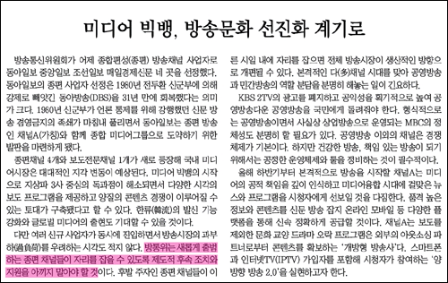 얼마 전 방송통신위원회가 지상파 방송에 중간광고를 허용하는 방송법 시행령 개정을 의결하자 조선일보와 동아일보 등은 “선물”,“특혜 완성판”,“시청자는 안중에도 없는가”라며 맹비난을 퍼부었다. 이들은 종편방송 TV조선, 채널A를 운영하고 있으므로 지상파는 방송시장 특히 방송광고시장에서 직접적 경쟁자이다. 지상파 중간광고 허용에 대해 비판할 수 있고 언론으로서 보도할 만한 사안이기도 하다.