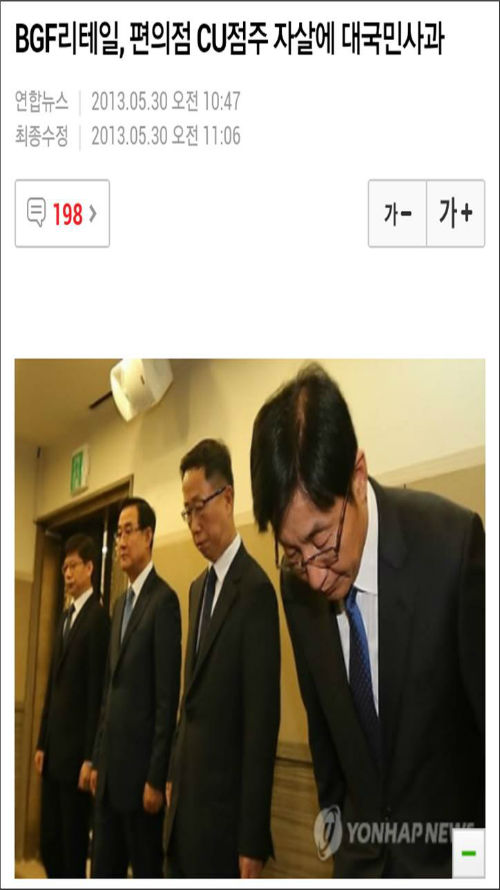 “CU 홍석조 회장은 중앙일보 홍석현 회장의 동생, 범 삼성가! 자기들의 횡포로 고통받다 목숨을 끊은 가맹점주를 사실상 두 번 죽인 패륜적인 행위 사과하면 끝?”(seo****), “쓰레기 회사가 넘쳐나는군요. 대기업과 재벌의 도덕적 해이가 도에 달했네요”(sun*******) 등의 비난 글들이 계속해서 쏟아졌다.