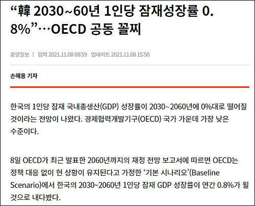 중앙일보는 8일 <“韓 2030∼60년 1인당 잠재성장률 0.8%”..OECD 공동 꼴찌>, 9일 <한국 잠재성장률 0.8% 전망, OECD국 꼴찌>란 비슷한 내용의 기사를 잇달아 냈다.