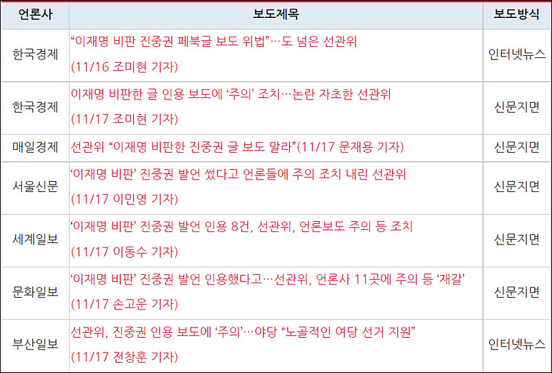 또한 언론은 인터넷선거보도심의위원회가 진중권 씨 SNS 인용보도 자체를 금지하는 것처럼 전하며 ‘언론자유 침해’, ‘재갈 물리기’ 등의 표현을 썼는데요. 뉴데일리 <이게 중립?…선관위 ‘진중권의 이재명 비판’ 인용 언론사 11곳에 ‘조치’>(11/18 김현지 기자)에 등장한 ‘심의위 관계자’에 따르면 인터넷선거보도심의위원회는 “‘진중권 논객’의 이야기를 인용해서 문제 삼은 것이 아니라, 과장‧허위‧비방 등 표현이 문제”라서 ‘주의’ 혹은 ‘공정보도 협조요청’ 조치를 내린 것입니다. “반론이 충분히 들어갔거나 표현을 순화해 비판한 부분은 (이의신청) 대상도 아니었다”고 인터넷선거보도심의위원회 관계자는 설명하기도 했습니다.