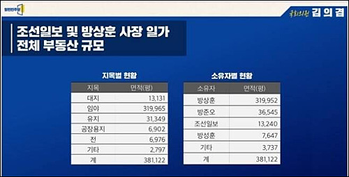 김 의원에 따르면 조선일보와 방상훈 사장 일가는 여의도 면적의 45%에 달하는 40만 평의 토지를 보유하고 있다. 공시지가만 4,800억 원으로 실제 시세는 2조 5000억에 달한다.