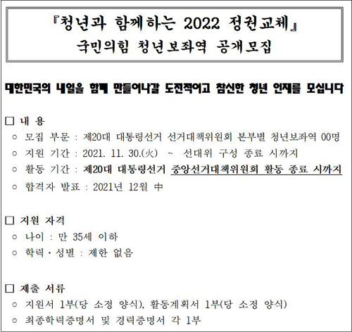 지난달 30일 국민의힘은 당 홈페이지에 선거대책위원회 본부별 청년보좌역 공개모집 공지를 올렸다. 나이는 만 35세 이하, 학력과 성별에는 제한을 두지 않았다. 하지만 해당 공지에 첨부되어 있는 지원서에는 학력 기재 항목이 버젓이 마련되어 있다. 활동기간도 ‘제20대 대통령선거 중앙선거대책위원회 활동 종료시까지’로 못 박아두고 있다.
