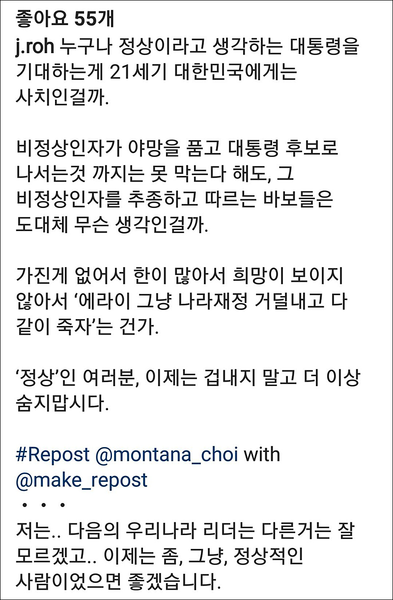 그러면서 작성자는 “한나라의 리더를 뽑는데, 열등감 양아치를 뽑을 수는 없지 않느냐”며 “이번에는 ‘제발 좀’ 속지 말고 정신차리라”고 주장했다.