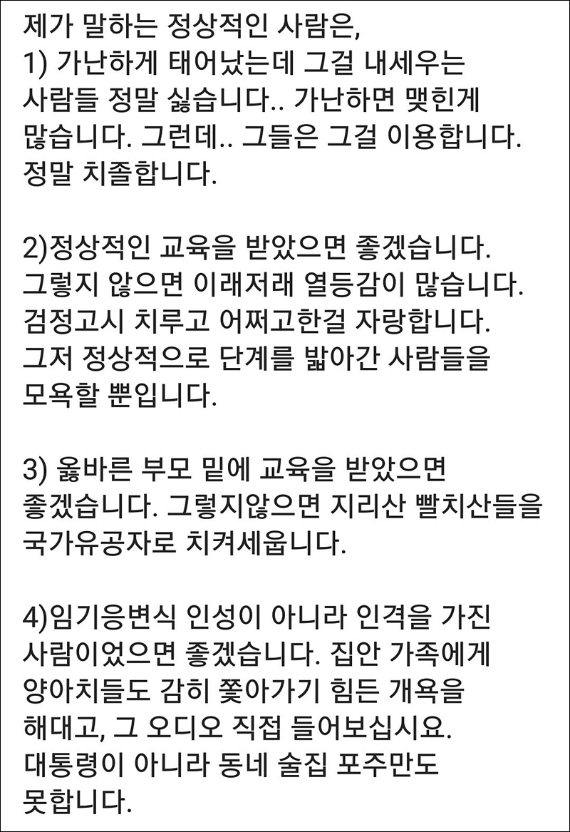 작성자는 해당 글에서 “다음의 우리나라 리더는 그냥 정상적인 사람이었으면 좋겠다”며 “가난하게 태어났는데 그걸 내세우는 사람들 정말 싫다, 가난하면 맺힌 게 많다”고 주장했다.