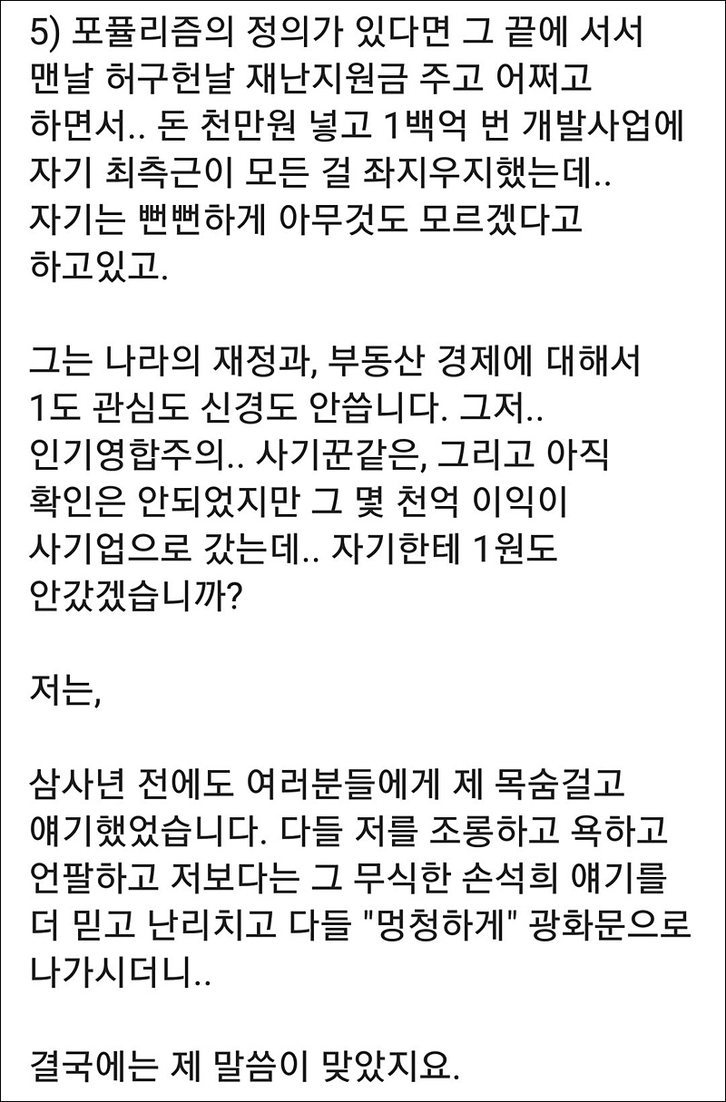 박근혜‧최순실 국정농단 당시 촛불집회를 비난하기도 했다. 작성자는 “3~4년 전에도 여러분들에게 제 목숨 걸고 얘기했었다”며 “다들 저를 조롱하고 욕하고 언팔하고 저보다는 그 무식한 손석희 얘기를 더 믿고 난리치고 다들 ‘멍청하게’ 광화문으로 나가시더니”라고 했다.