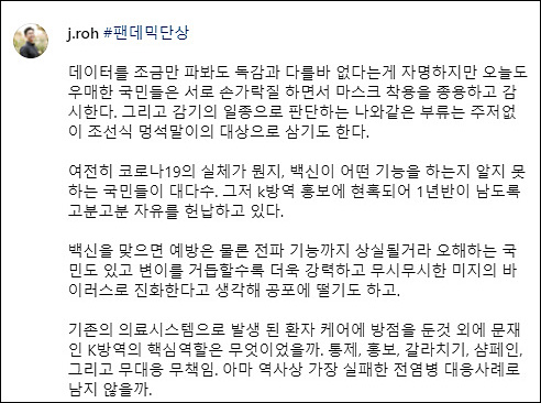 이어 “(대다수 국민들은)그저 K방역 홍보에 현혹돼 1년 반 넘도록 고분고분 자유를 헌납하고 있다”며 “통제, 홍보, 갈라치기, 샴페인, 그리고 무대응 무책임, 아마 역사상 가장 실패한 전염병 대응사례로 남지 않을까”라고 정부의 방역정책을 비판했다.