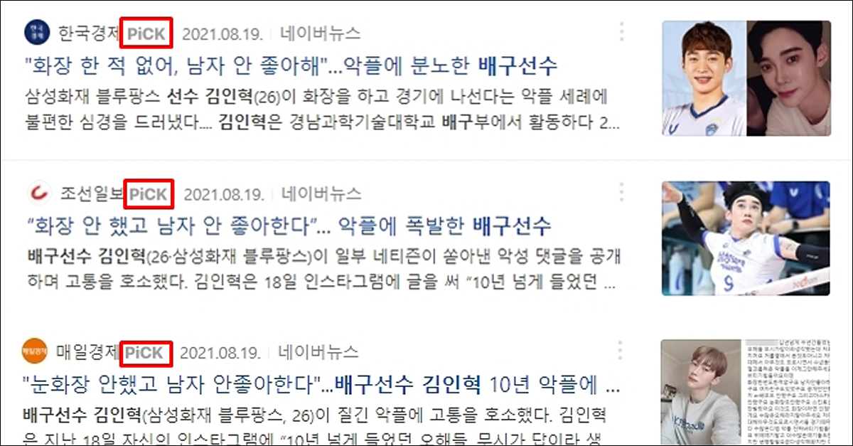 배구선수 김인혁 씨의 경우 그가 선수 생활을 시작한 후 지금까지 경기력을 다룬 보도도 많았지만, 2021년 8월 SNS에 악플로 인한 고통을 호소하고 위키트리가 이를 기사화하자 그를 둘러싼 가십성 기사가 등장하기 시작했습니다.