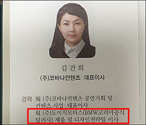 김 씨는 ‘코바나컨텐츠 공연기획 및 컨텐츠 사업 대표이사’라는 직함과 함께 ‘현직 도이치모터스(BMW코리아공식딜러사) 제품 및 디자인전략팀 이사’라는 직함을 기재했다.