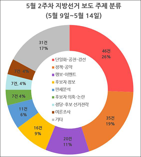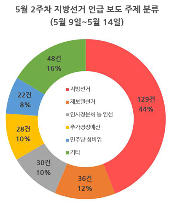 5월 9일부터 14일까지 지방선거가 언급된 보도는 총 293건으로 그중 ‘지방선거’를 주요하게 다룬 보도는 129건(44%)입니다. 5월 1주차 지방선거 언급보도 256건, 지방선거 중점보도 83건(32%)에 비해 46건(12%p) 늘었습니다.