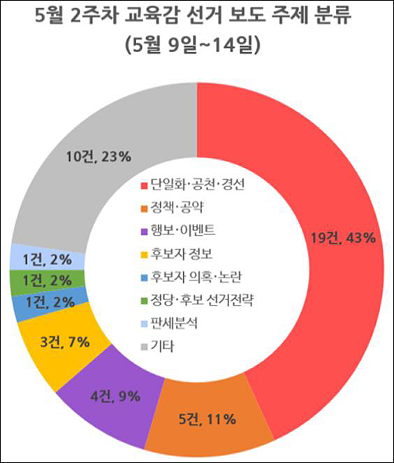 5월 2주차 교육감 선거보도는 중앙일보가 10건으로 가장 많았고, 조선일보 7건, 경향신문‧한국경제 각 4건 순입니다. 한겨레는 해당 기간 8개 신문 중 유일하게 교육감 선거 관련 기사를 한 건도 내지 않았습니다. 교육감 선거를 다룬 기사는 총 31건인데 주제를 중복 계산해 살펴본 결과, 총 44건의 주제 중 19건(43%)이 단일화에 쏠려 있습니다. 교육감 후보의 정책과 공약을 살펴본 보도는 5건(11%), 후보에 관한 기본 정보를 살펴본 보도는 3건(7%)에 머물렀습니다.