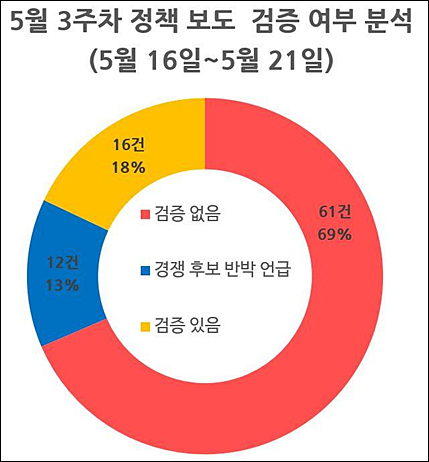 그러나 정책‧공약을 다룬 기사가 늘었다고 해서 모두 양질의 기사인 것은 아닙니다. 5월 3주 차 정책‧공약으로 분류된 기사 89건의 정책 검증 여부를 살펴보니, 실제 공약을 검증한 기사는 18%(16건) 수준입니다. 오히려 검증 없이 받아쓴 경우가 69%(61건)였고, 경쟁 후보의 반박을 언급한 수준에 그친 경우도 13%(12건) 비중을 차지했습니다.