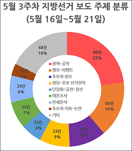 지방선거 중점 보도 248건의 주제를 분석해보니, 정책․공약을 다룬 기사가 89건(23%)으로 그 비중이 가장 높았는데요. 그 뒤를 행보․이벤트 60건(16%), 후보자 정보 40건(10%), 정당․후보 선거 전략 33건(9%) 등이 이었습니다. 이는 한 기사에서 여러 주제를 다뤘을 경우 분량을 기준으로 최대 3개 주제를 뽑아 중복 계산한 것으로 언급된 주제의 총 횟수는 384회입니다. 직전 주는 단일화․공천․경선 주제를 다룬 기사가 43건(26%)로 1위였으나, 후보자 등록이 마감되고 5월 19일 선거운동이 본격 개시되면서 지역 후보 정책과 공약을 전달하는 기사가 많아진 영향으로 보입니다. 정책․공약 보도는 2주 차에 비해 54건(4%p) 늘었습니다.