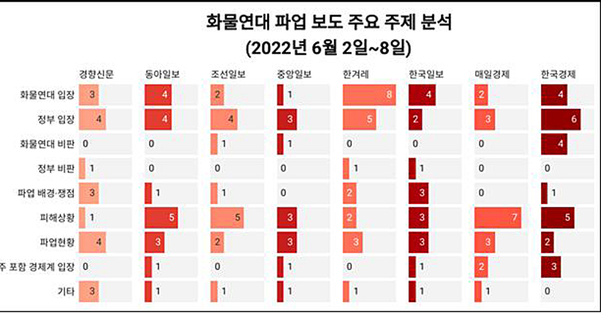 * 모니터 기간과 대상 : 2022/06/02~06/08 ‘화물연대’ 키워드가 언급된 경향신문, 동아일보, 조선일보, 중앙일보, 한겨레, 한국일보, 매일경제, 한국경제 지면보도