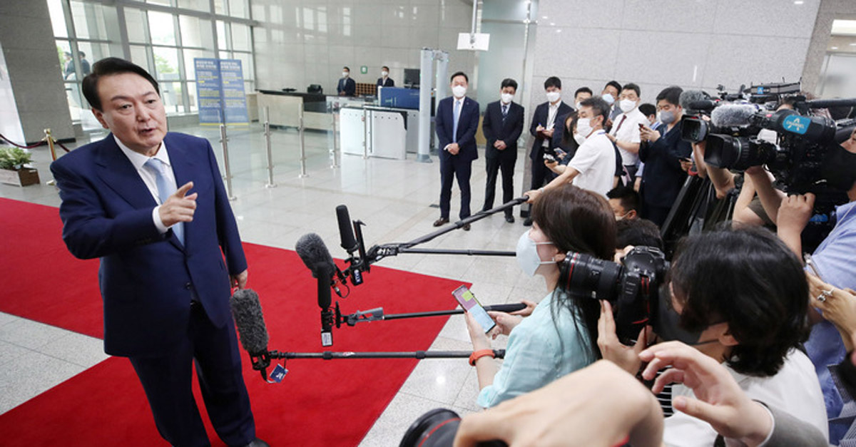 그러자 윤 대통령은 검지손가락을 치켜세워 좌우로 흔들며 “다른 정권 때하고 한 번 비교를 해보라. 사람들의 자질이나 이런 것을”이라고 잘라 말했다. 이어 윤 대통령은 더 이상의 질문을 받지 않고 서둘러 자리를 떠났다.