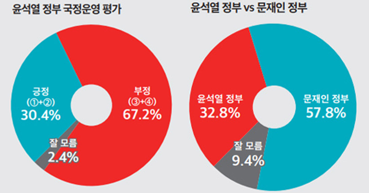 ‘윤석열 정부를 전임 문재인 정부와 비교할 때 어느 정부에 더 높은 점수를 주겠느냐’는 질문에 응답자의 57.8%가 ‘문재인 정부가 낫다’고 응답했다. ‘윤석열 정부가 낫다’는 응답은 32.8%였고 ‘잘 모르겠다’는 9.4%였다.