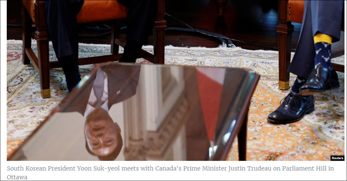 해당 사진은 윤 대통령이 지난 23일(현지시간) 쥐스탱 트뤼도 캐나다 총리와 오타와 총리 집무실에서 환담을 하는 모습이다. 로이터 통신은 집무실 탁자에 비친 윤 대통령의 ‘거꾸로 된 얼굴’에 초점을 맞춰 전했다.