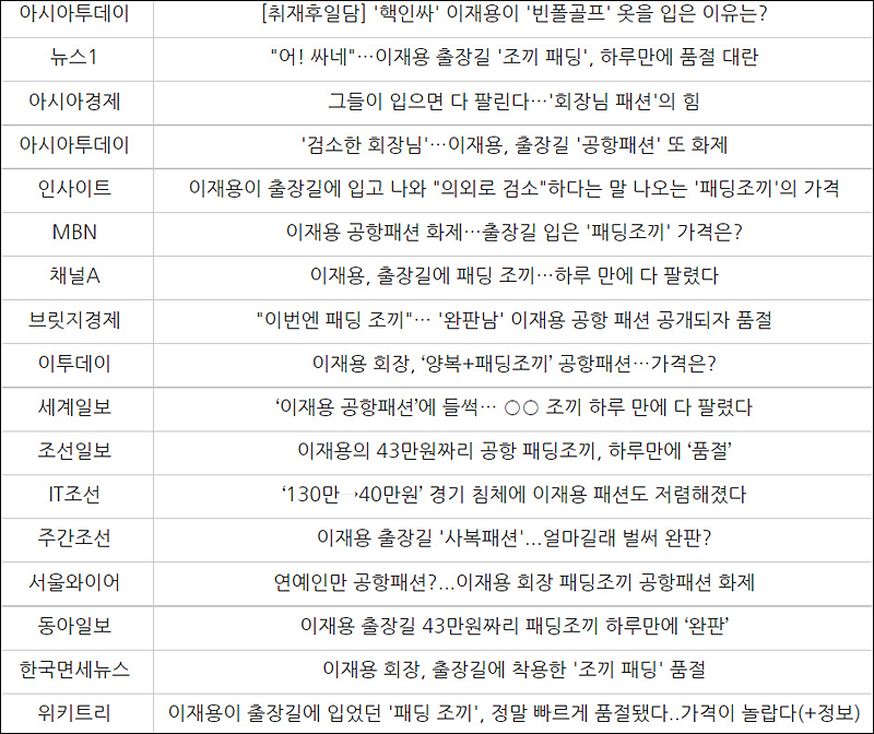 언론은 패딩 조끼의 가격에도 주목했습니다. 12월 21~22일 이재용 부회장 ‘패딩 조끼’ 관련 기사 41건 모두 해당 제품의 가격을 기술했는데요. 동아일보 <이재용 출장길 43만원짜리 패딩조끼 하루만에 ‘완판’>(12월 22일 정봉오 동아닷컴 기자)처럼 옷의 가격을 제목에 적거나 헤럴드경제 <이재용의 공항패션, “검소하네” 커뮤니티 달군 조끼 가격은>(12월 22일 이원율 기자)처럼 가격 궁금증을 제목으로 뽑았습니다. 세계일보 <‘이재용 공항패션’에 들썩…○○ 조끼 하루 만에 다 팔렸다>(12월 22일 현화영 기자)는 해당 제품의 “가격도 화제가 됐”는데 “회장님 패션이라고 하기엔 생각보다 저렴했다는 평가가 나”온다고 설명했습니다.