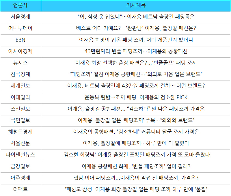 머니투데이 <베스트 어디 거예요?…‘완판남’ 이재용, 출장길 패션은?>(12월 21일 차유채 기자)도 제품명과 가격을 상세히 보도하며 “이번 아우터 역시 ‘완판남’ 이 회장답게 품절 대열에 합류할 것인지 관심이 집중”된다며 기대감을 드러냈습니다. 머니투데이는 “이 회장은 2019년 12월 137만원대의 패딩 점퍼를 완판시켰”고 “2014년 미국의 IT컨퍼런스에 방문했을 때 입었던 언더아머 티셔츠는 ‘이재용 운동복’”, “심지어 이 회장이 2016년 청문회장에서 발랐던 소프트립스 립밤 역시 ‘이재용 립밤’으로 불리며 품절”됐다며 이 부회장의 ‘완판남’ 이미지를 강조했습니다.