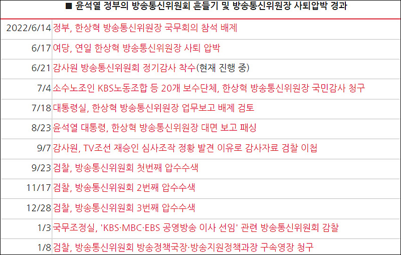 지난 1년간 방송통신위원장을 찍어내기 위한 윤석열 정부의 압박은 계속됐습니다. 집권 초기부터 한 위원장을 국무회의에서 배제하고 사퇴를 종용하는가 하면, 지난해 6월 시작한 감사원의 정기감사는 1년이 돼가도록 마무리되지 않고 있습니다. 감사원 감사내용을 이첩 받은 검찰은 한 위원장이 TV조선 재승인 심사 당시 점수를 낮게 수정하라고 지시했다는 혐의로 3월 24일 구속영장을 청구했으나 법원은 3월 30일 기각했습니다.