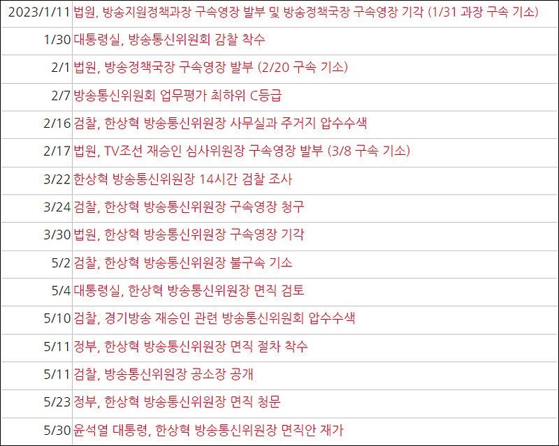 이후 검찰은 5월 2일 불구속 기소를 했고, 대통령실은 윤석열 정부 출범 1주년이 되는 5월 10일 기소를 이유로 한 위원장에 대한 면직 카드까지 꺼내 들었습니다. 그리고 5월 30일, 한 위원장이 임기를 채우겠다는 의지를 굽히지 않자 2개월밖에 남지 않은 임기마저 보장하지 않은 채 방송통신위원장 강제 해임에 나섰습니다.