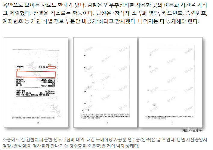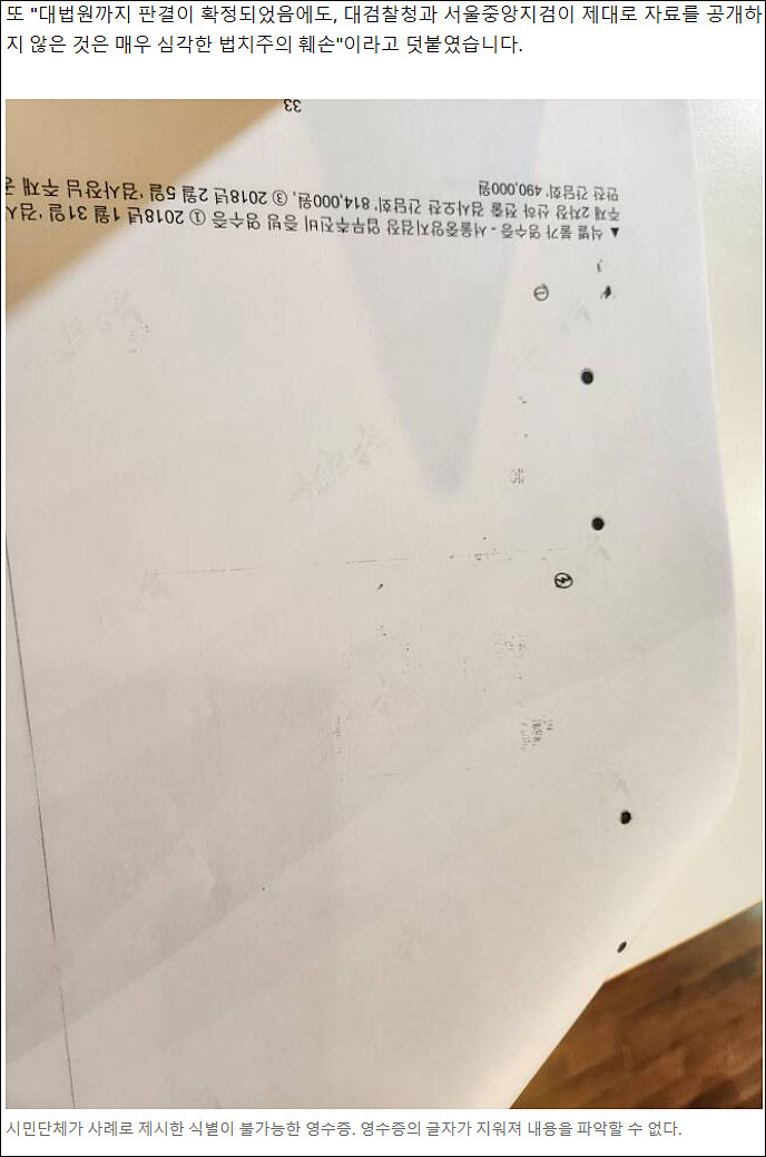 이들은 “당연히 존재해야 할 특활비의 지출증빙자료가 무단 폐기되었다는 의혹, 용도와 목적에 맞지 않게 사용되었다는 의혹, 검찰이 법원을 기만하기 위해 자료가 존재하지 않는다는 허위공문서를 작성하고 제출한 부분, 법원 판결문을 무시하고 업무추진비 정보 일부를 은폐한 부분 등에 대해 철저한 진상규명이 필요하다”고 밝혔다.