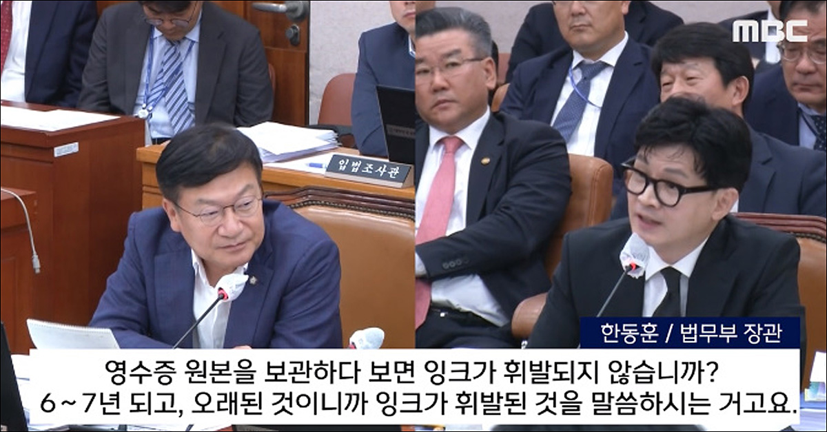 한동훈 장관은 “영수증을 오래 보관하다 보면 잉크가 휘발된다, 6~7년 되고, 오래된 것이니까 잉크가 휘발된 것”이라며 “저희는 보관한 그대로 그 내용을 보여드린 것”이라고 답했다.