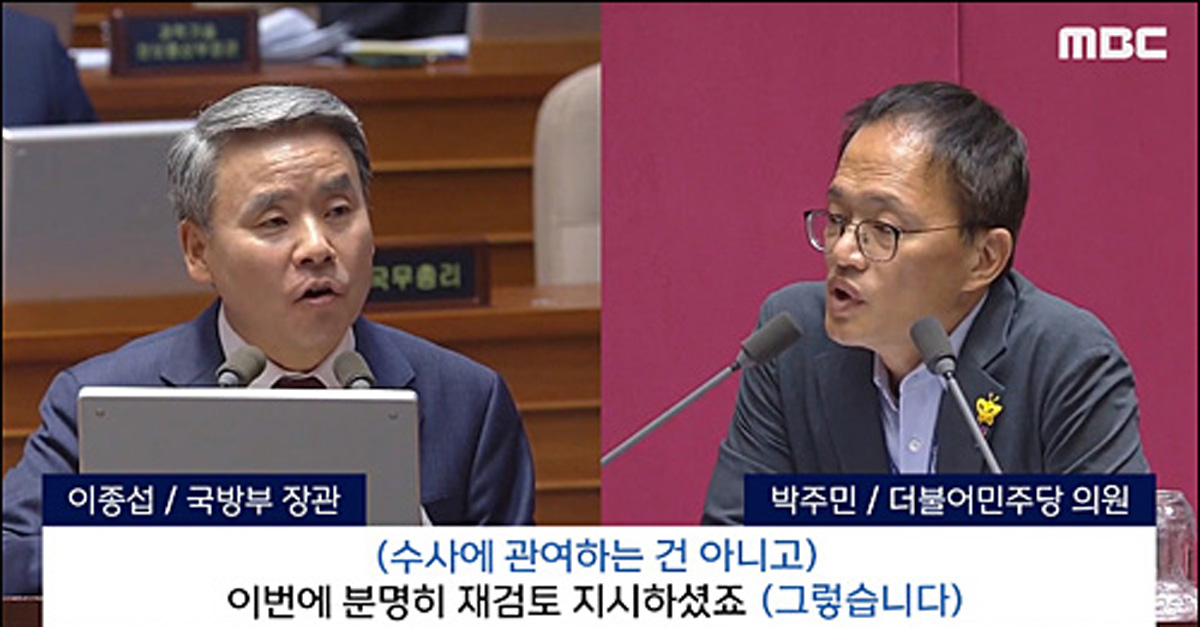 이종섭 장관은 박주민 민주당 의원의 “왜 재검토를 지시했는가”라는 질문에 “(채 상병 사망 당시) 지휘 관계에 있는 8명 전부를 업무상과실치사 혐의로 했기 때문에”라고 답했다.
