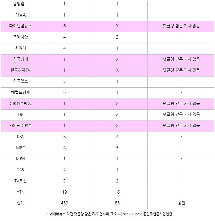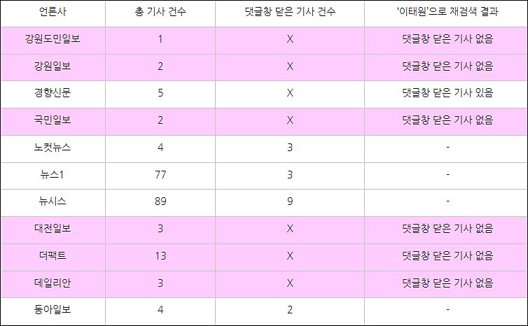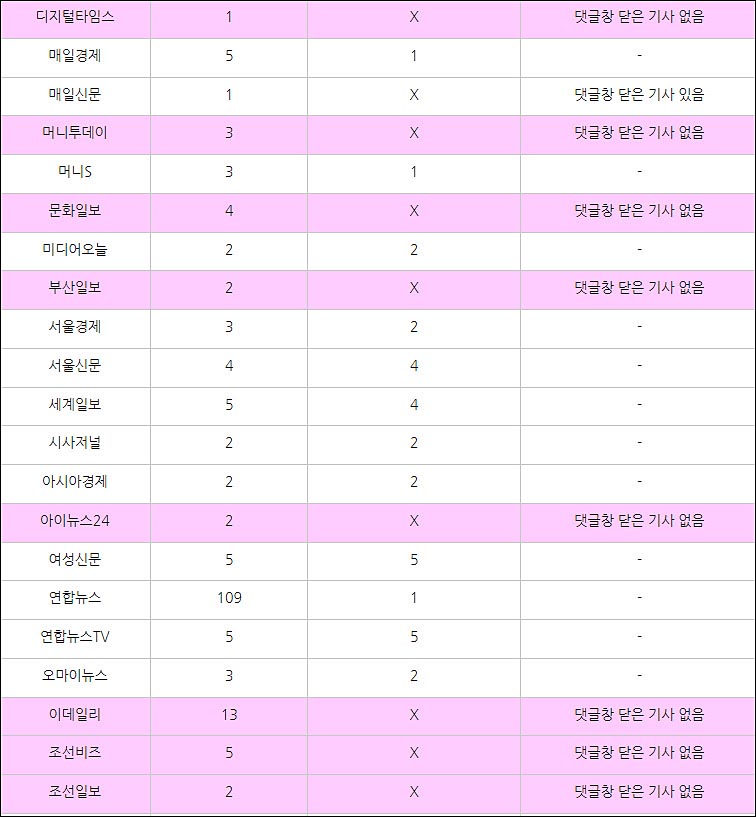 댓글창을 열어둔 기사도 있지만 한 번이라도 댓글창을 닫았던 언론사도 있습니다. 댓글창 문제를 인식했으나 관련 보도 댓글창을 모두 닫는 데는 기준이 모호하다고 느꼈거나 소극적이었다고 하겠습니다. 위 9개 언론사를 제외하고 노컷뉴스, 뉴스1, 뉴시스, 동아일보, 매일경제, 머니S, 서울경제, 세계일보, 연합뉴스, 오마이뉴스, 프레시안, 한겨레, 한국일보, 헤럴드경제, KBS, MBC, SBS, TV조선, YTN 등 19개 언론사입니다.