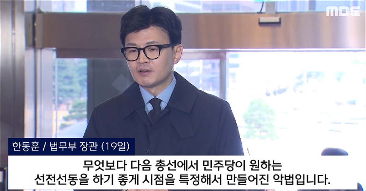 그는 “총선과 연계 지어 악법이라고 얘기하는 것은 정치인으로서의 얘기이지 법조인, 또 법무부 장관으로서의 답변은 절대 아니다”라고 강조했다.