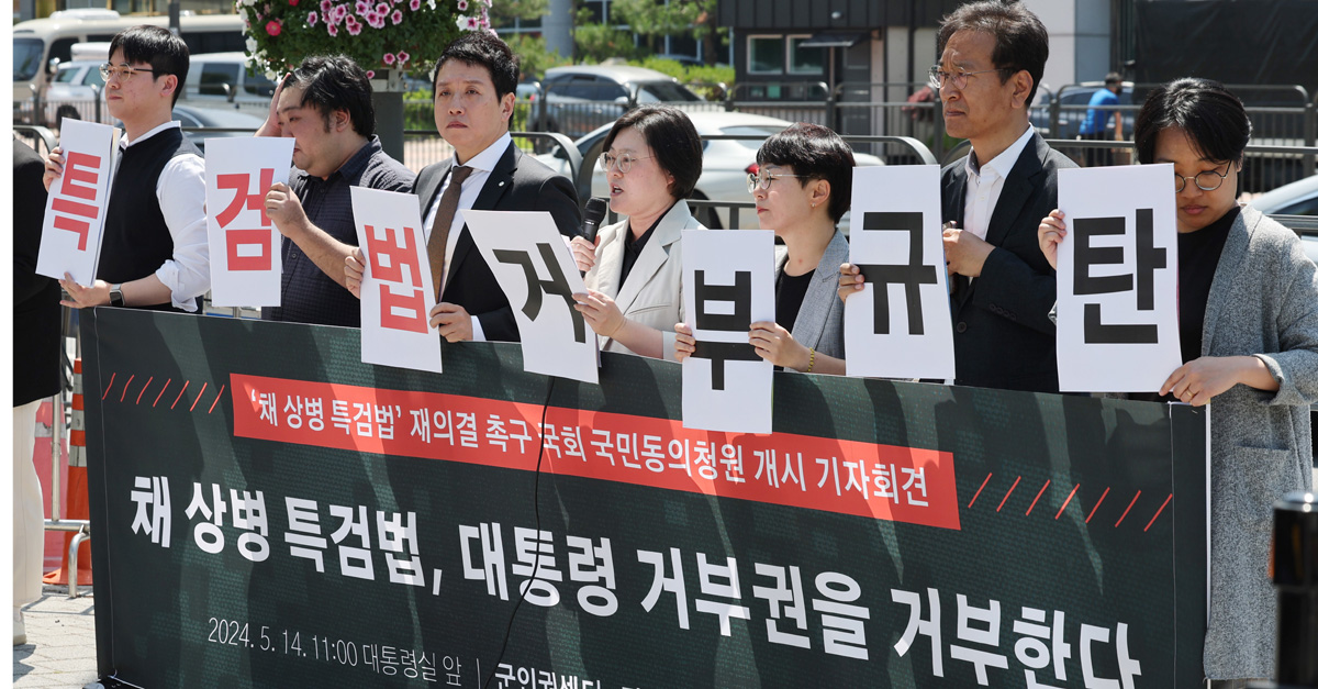 군인권센터와 민주사회를위한변호사모임, 참여연대 등은 14일 용산 대통령실 앞에서 기자회견을 열고 “채상병 특검법에 대한 거부권 행사는 윤 대통령의 10번째 거부권 행사로 사실상 국회의 의사결정을 무력화하는 결정이 될 예정”이라고 말했다.