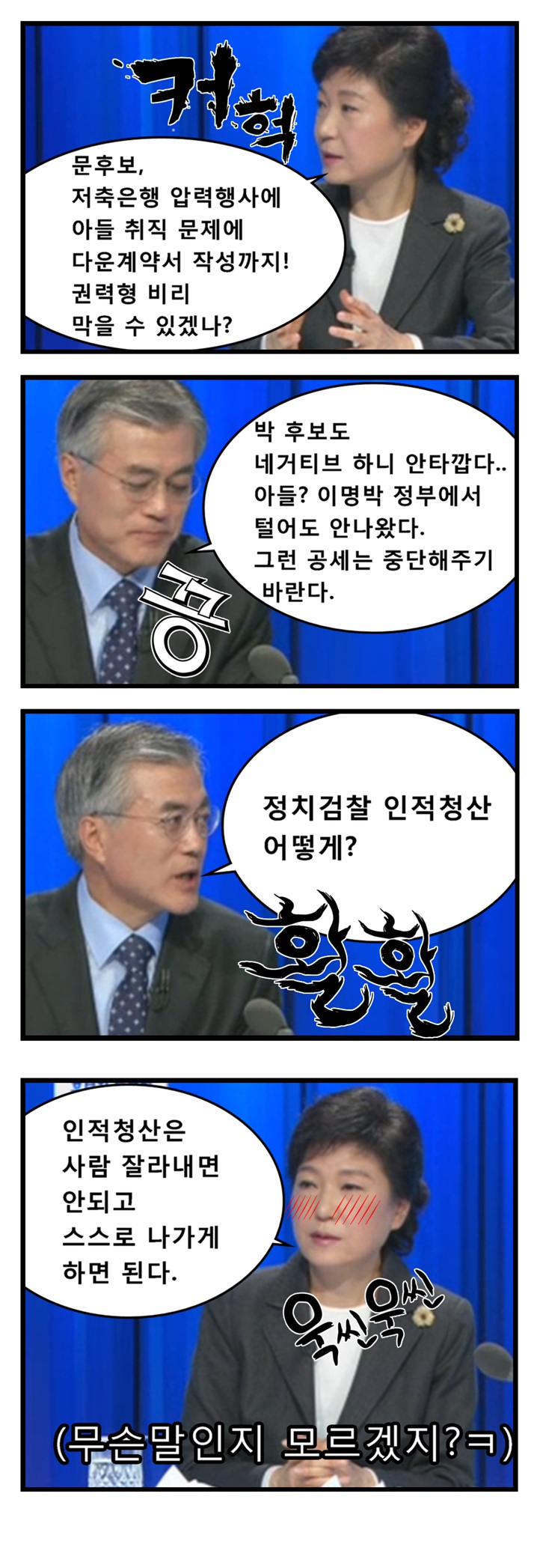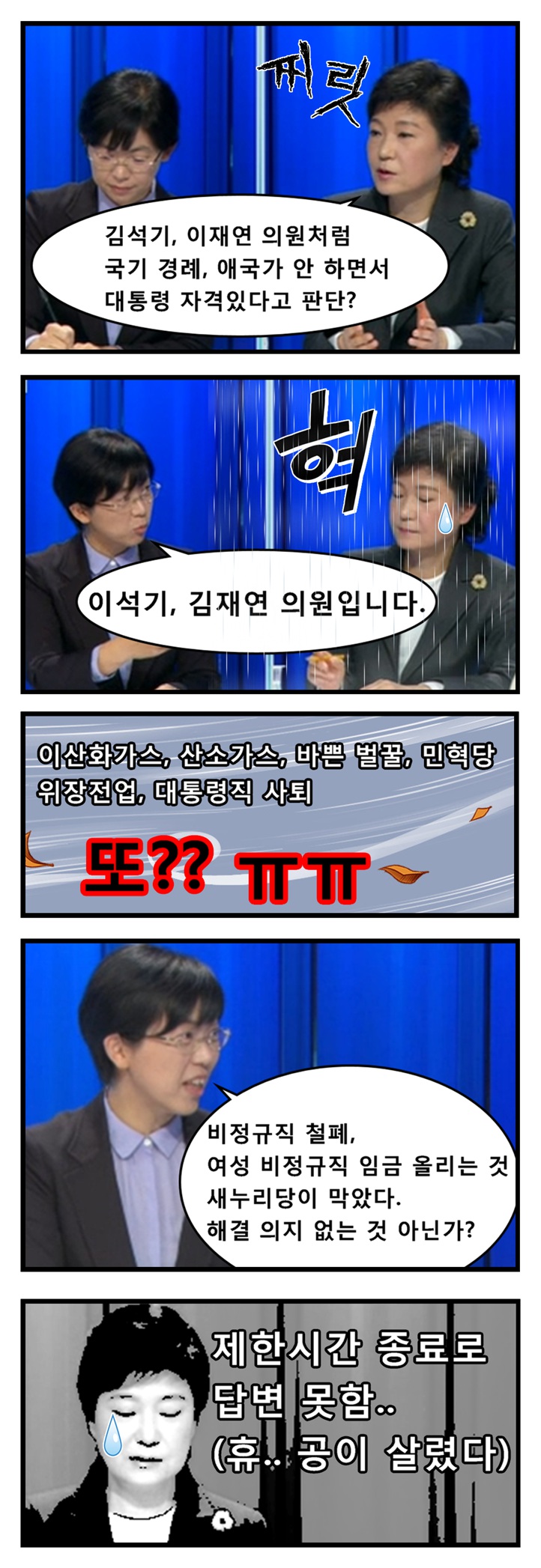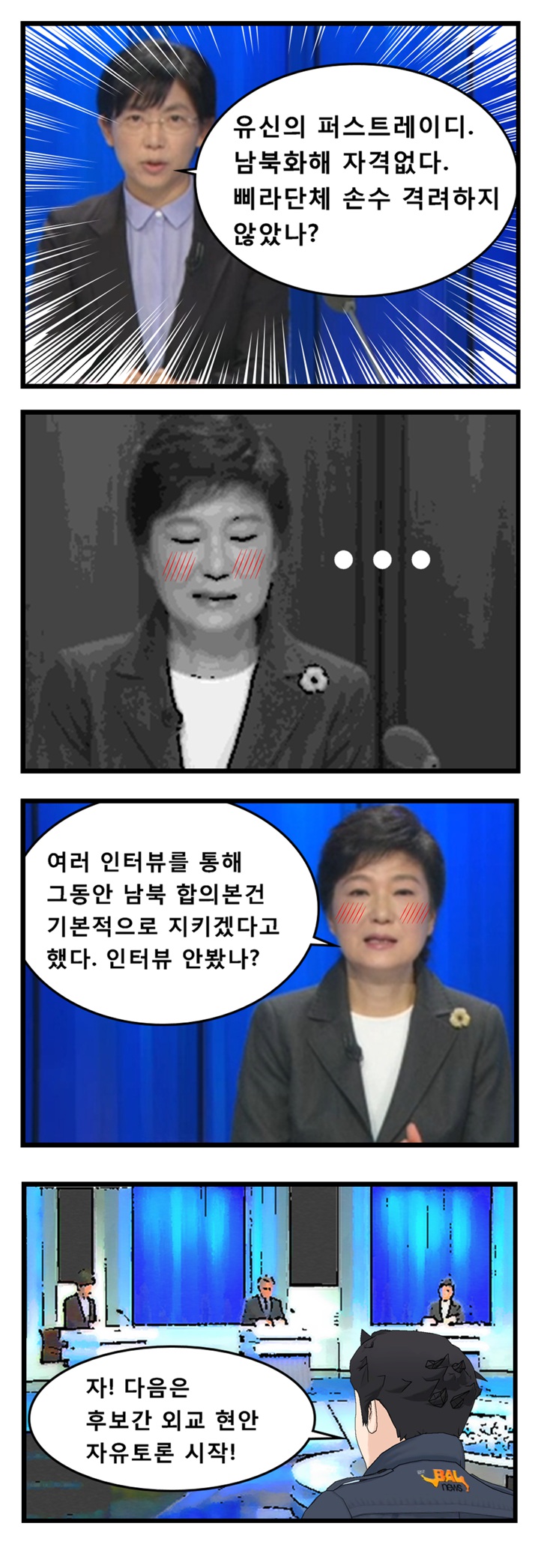 토론실종 비판 여론이 높은 가운데 중앙선거관리위원회의 주체로 4일 오후 8시 여의도 MBC에서 ‘18대 대통령 선거 후보자 토론회’가 처음으로 열렸다. 이정희 통합진보당 대선 후보는 이날 박근혜 새누리당 후보를 향해 “박근혜 후보를 떨어뜨리기 위해 이번 대선에 출마했다”고 돌직구를...