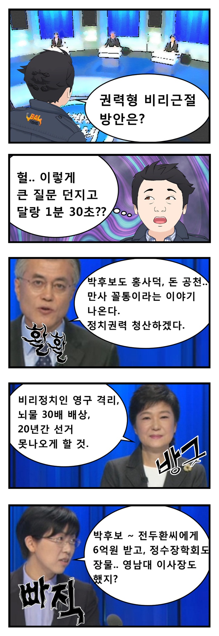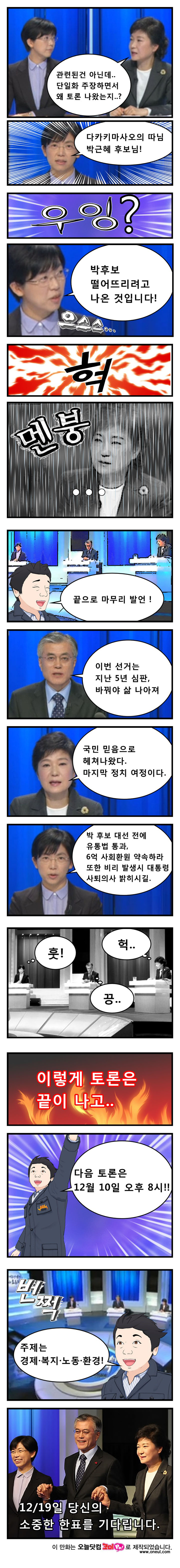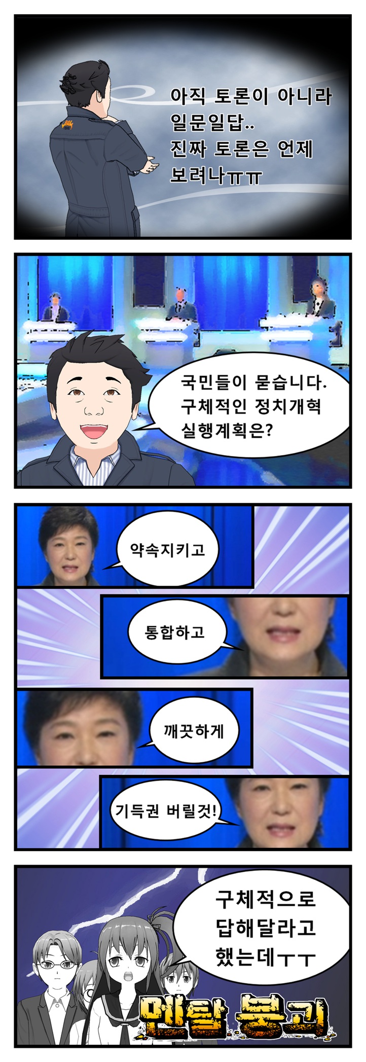 토론실종 비판 여론이 높은 가운데 중앙선거관리위원회의 주체로 4일 오후 8시 여의도 MBC에서 ‘18대 대통령 선거 후보자 토론회’가 처음으로 열렸다. 이정희 통합진보당 대선 후보는 이날 박근혜 새누리당 후보를 향해 “박근혜 후보를 떨어뜨리기 위해 이번 대선에 출마했다”고 돌직구를...