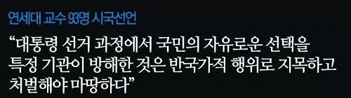 연세대학교 교수 93명이 국가정보원의 대선개입을 규탄하는 시국선언문을 내고 “대통령 선거 과정에서 국민의 자유로운 선택을 특정 기관이 방해한 것은 반국가적 행위로 지목하고 처벌해야 마땅하다”고 비판했다.