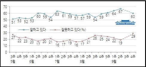 특히 서울의 경우 긍정평가는 종전의 60%에서 54%로 급락했으며, 반면 부정평가는 19%에서 34%로 증가했다.